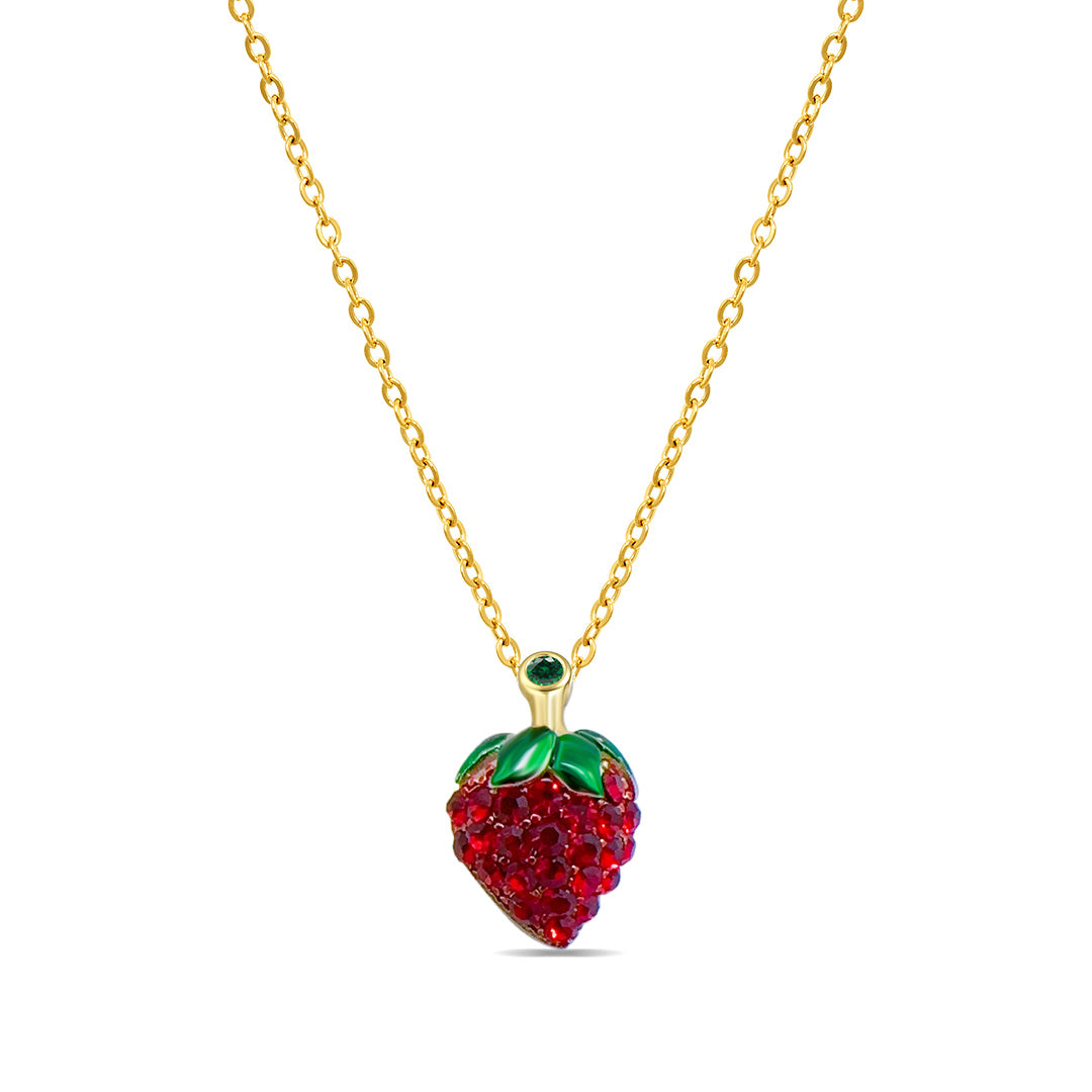 material : 925 sterling silver - plated with gold. stones ; zirconia Introducing our alluring Strawberry Sterling Silver Necklace, plated with gold for a touch of luxury. Delicately crafted in the shape of a succulent strawberry, this necklace is encrusted with shimmering red and green stones that add a pop of color and brilliance. The necklace comes with a durable chain that complements the pendant perfectly, making it a standout piece that is sure to turn heads. Meticulously crafted with high-quality materials, it guarantees longevity and is perfect for adding a touch of nature-inspired glamour to any outfit. Order now and add a touch of botanical allure to your jewelry collection.