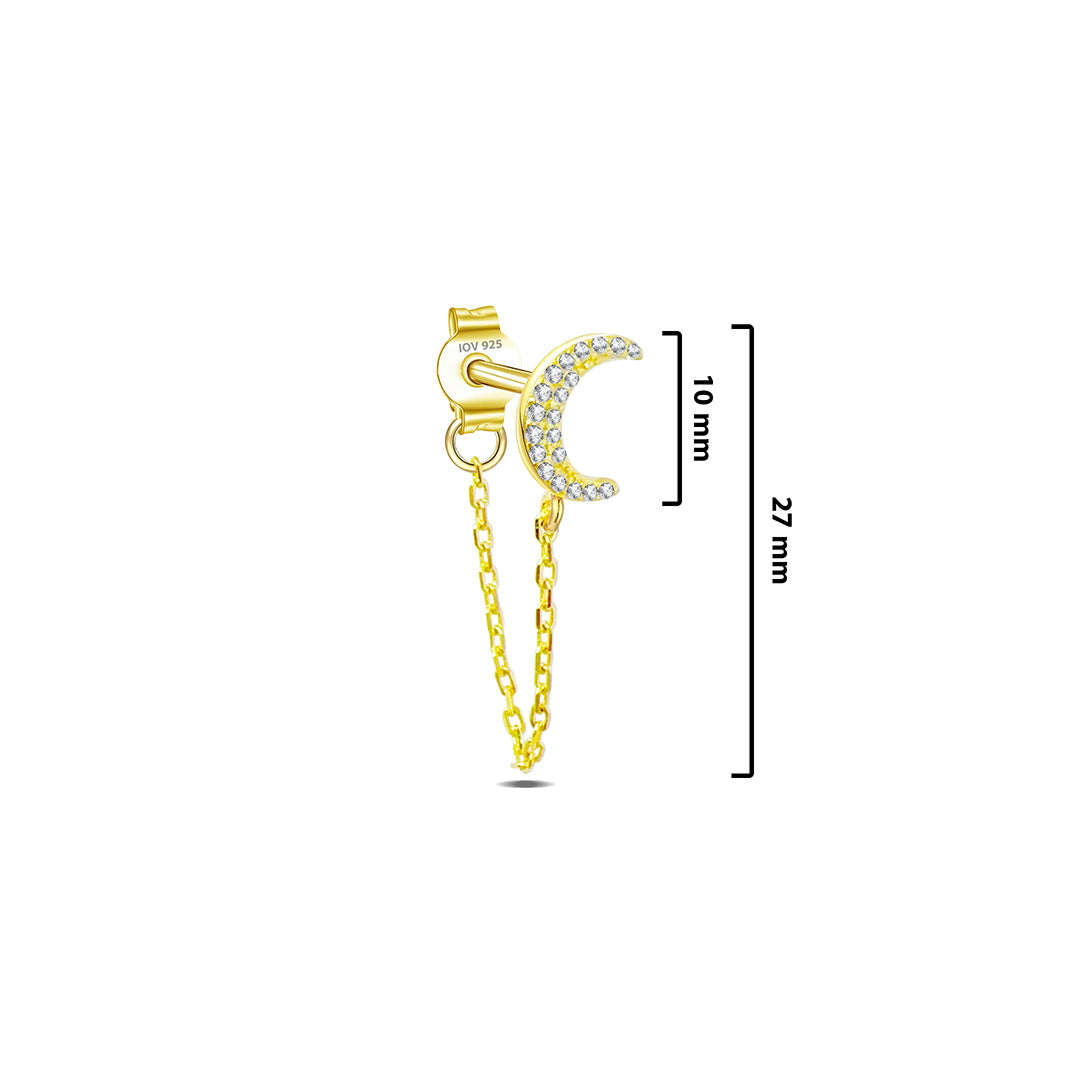 crescent shape stud earring with dangling chain.
