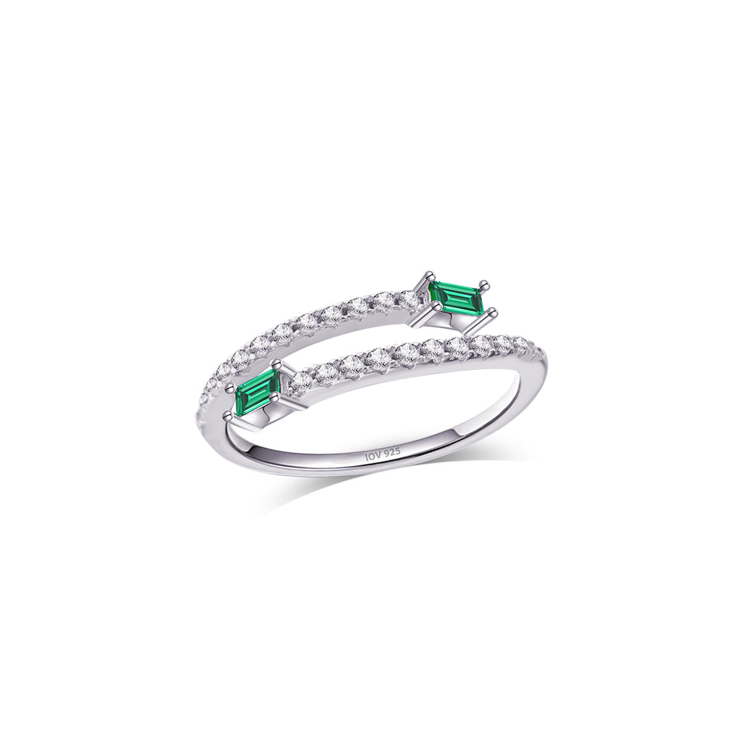 single line CZ open adjustable size ring with two emerald cut green stones.