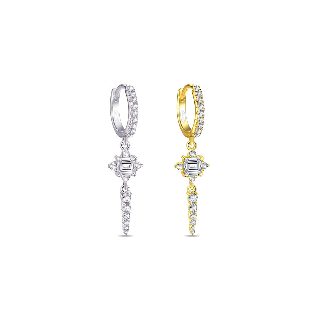 CZ luxury hoop earring with dangling rectangular stone and graduated round stones.