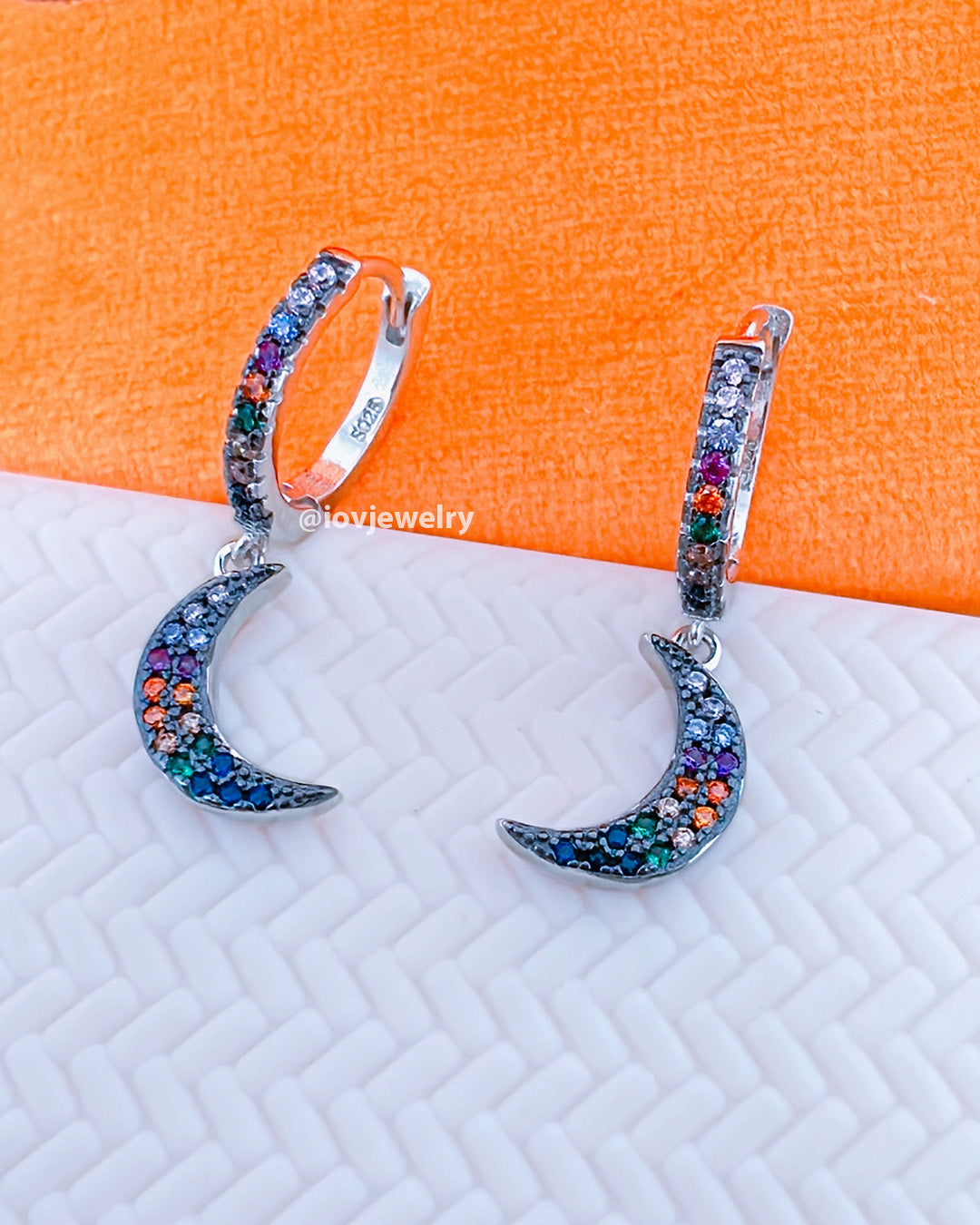 CZ multicolored dangling crescent hoop earring plated with black rhodium.