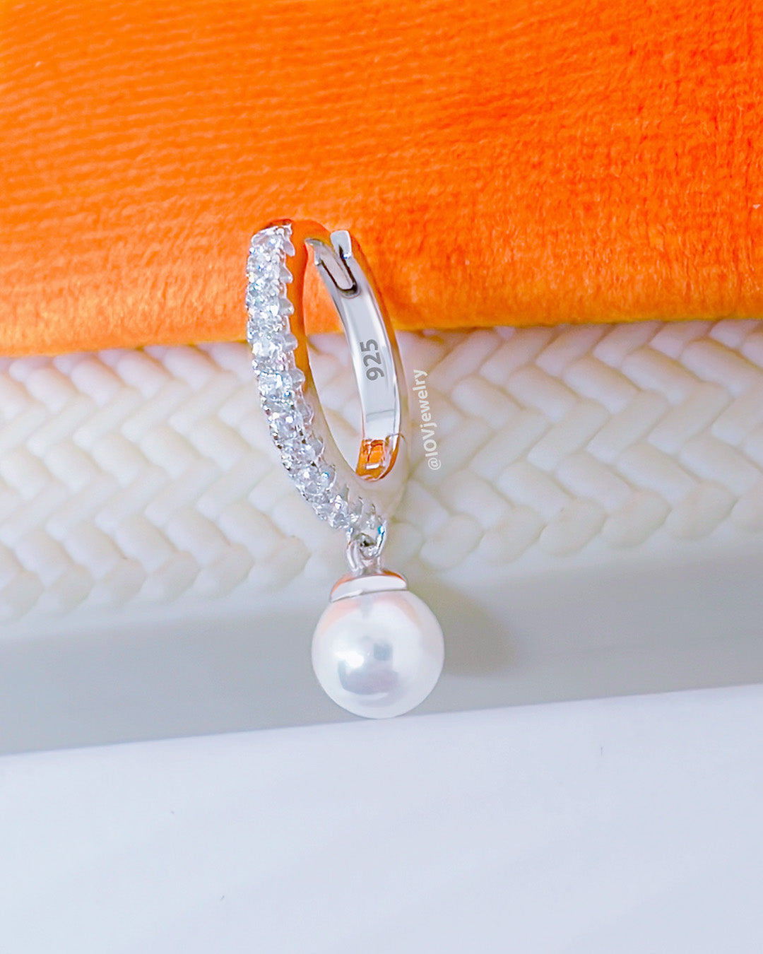 11 mm CZ hoop earring with dangling cultured pearl.
