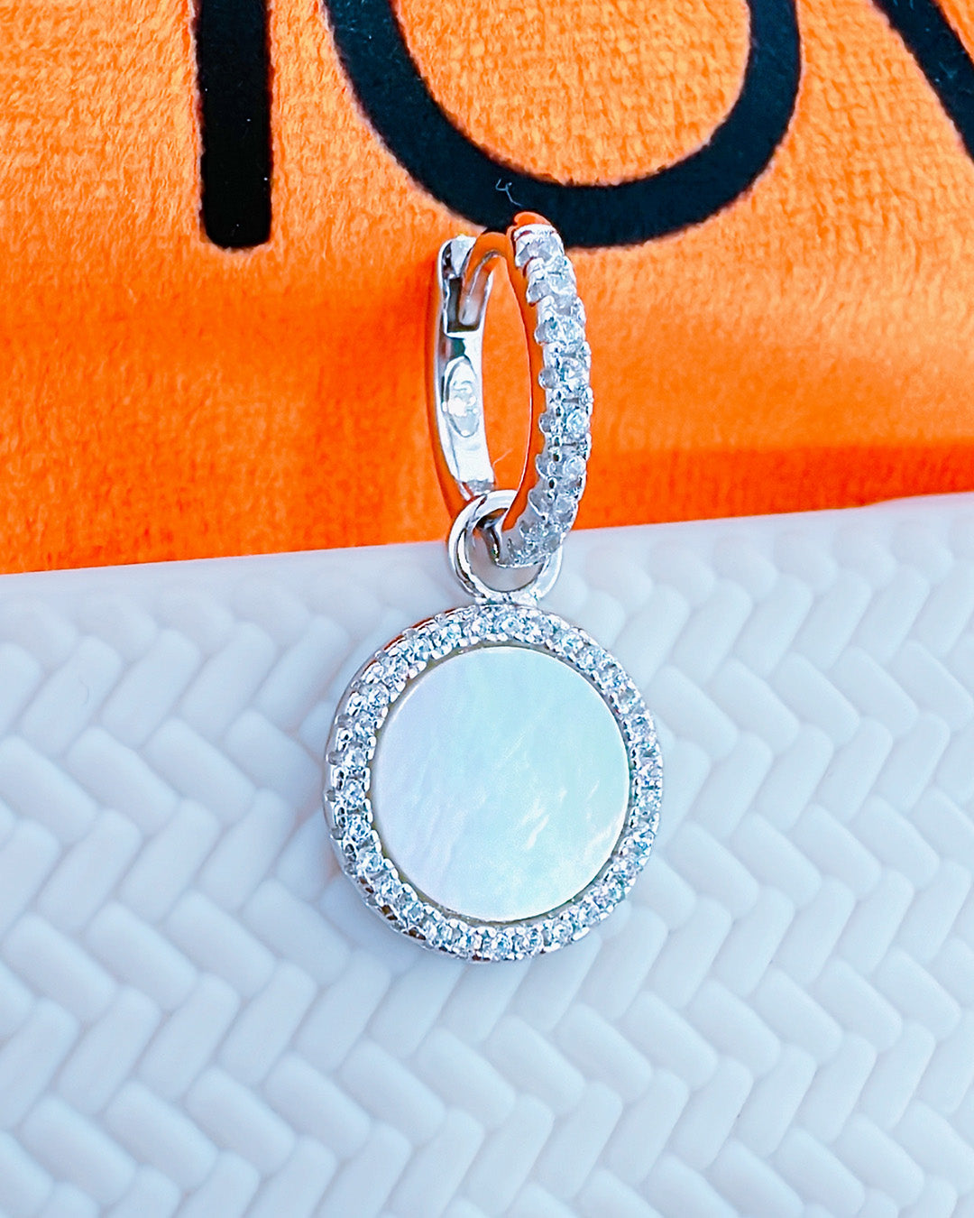 9mm CZ hoop earring with a mother of pearl dangling in a halo setting.