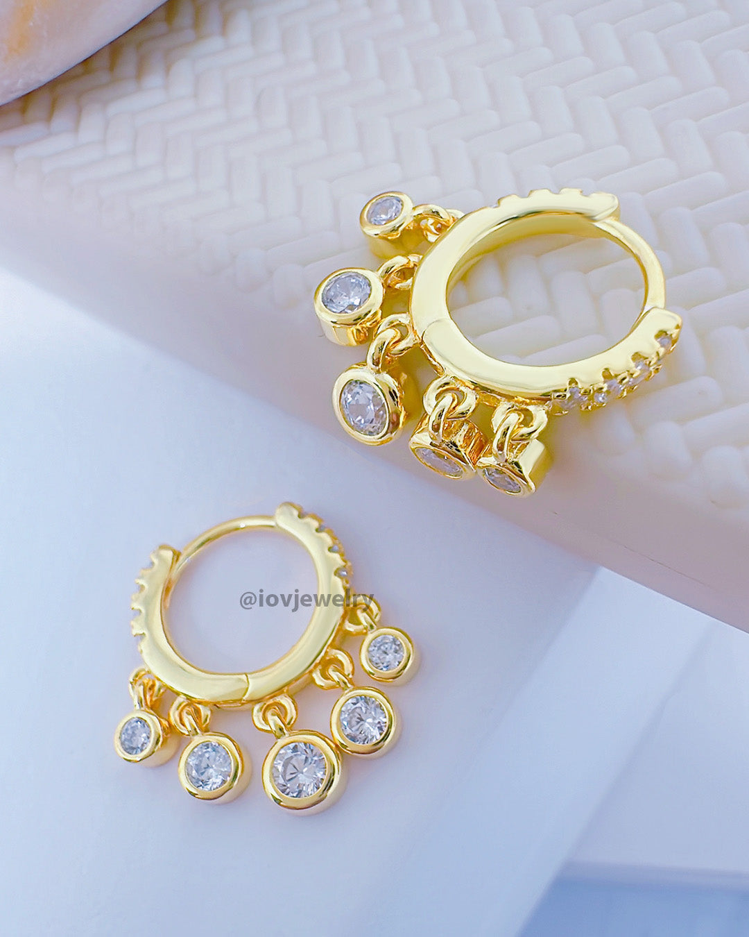 9mm huggie hoop earring with dangling CZ stones in bezel setting.