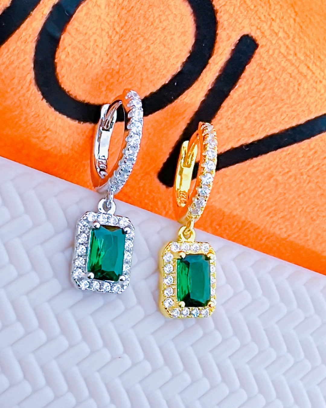 huggie hoop earring with dangling emerald color stone in halo setting.
