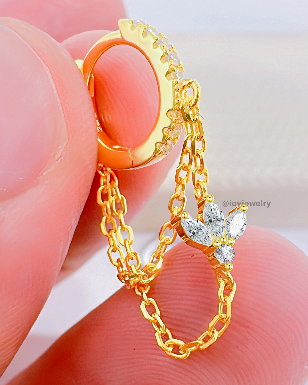 CZ huggie hoop with dangling double chains adorned with louts shape marquise stones.