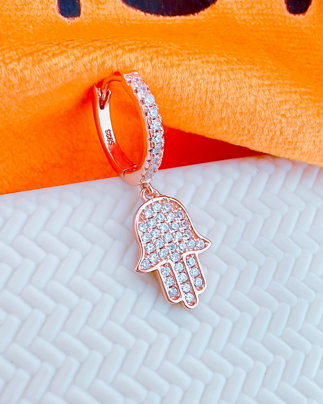 rosegold huggie hoop earring with dangling hamsa shape earring.