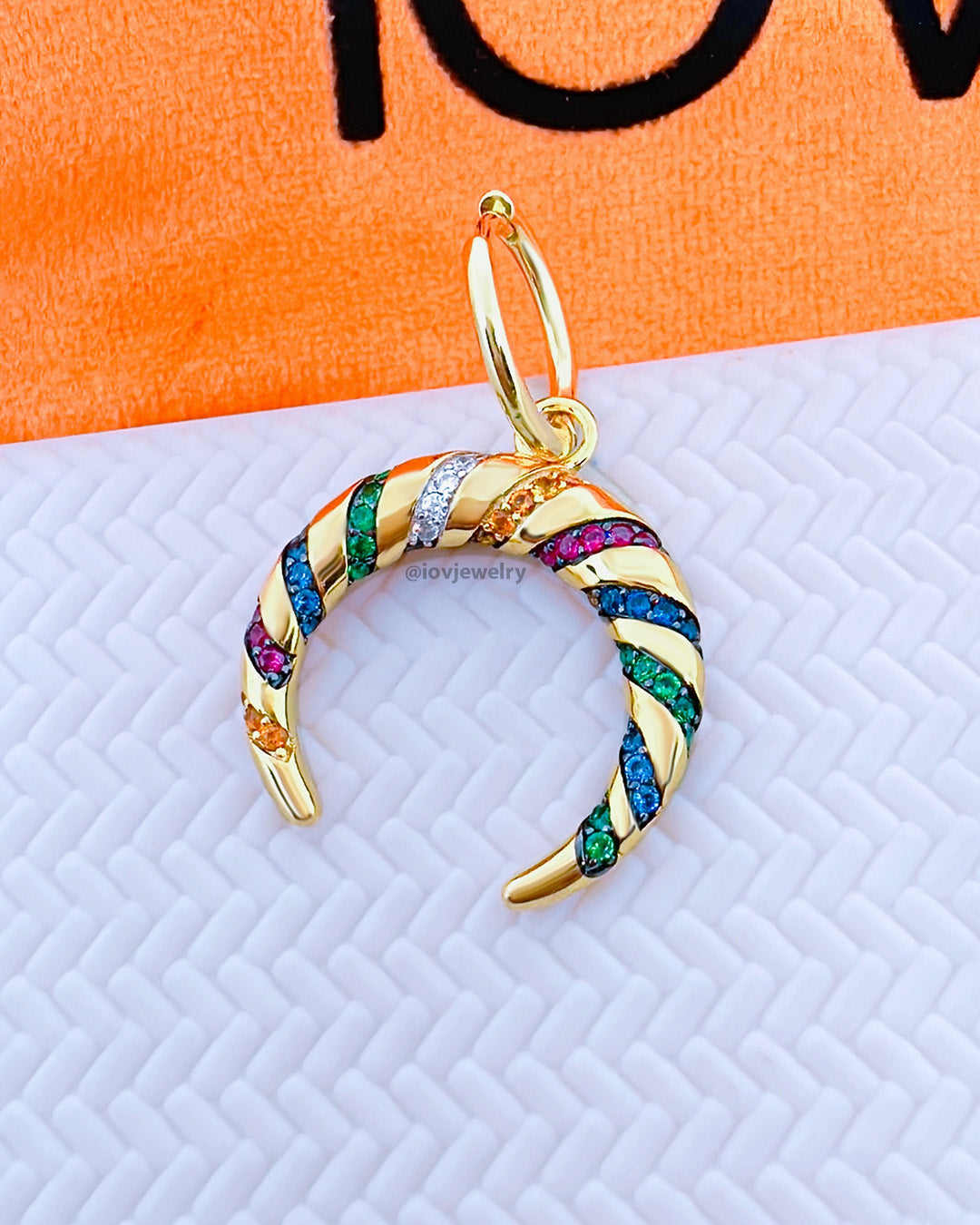 plain hoop with dangling crescent shape studded with colorful CZ.