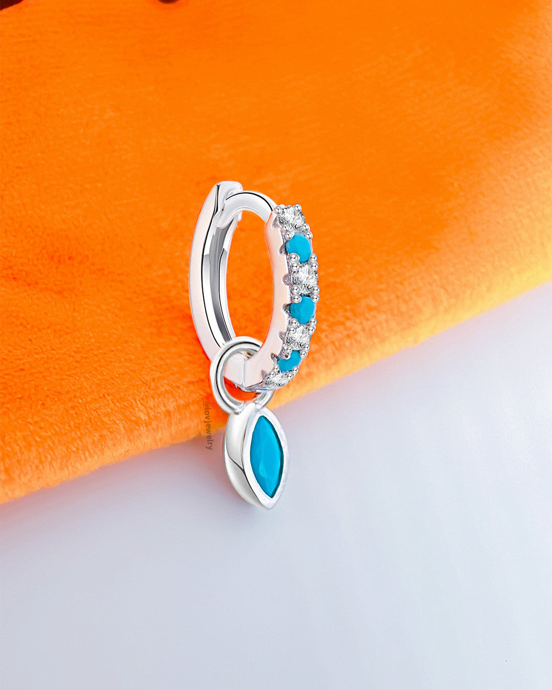 white CZ and turquoise stones huggie hoop with removable dangling marquise shape turquoise stone.