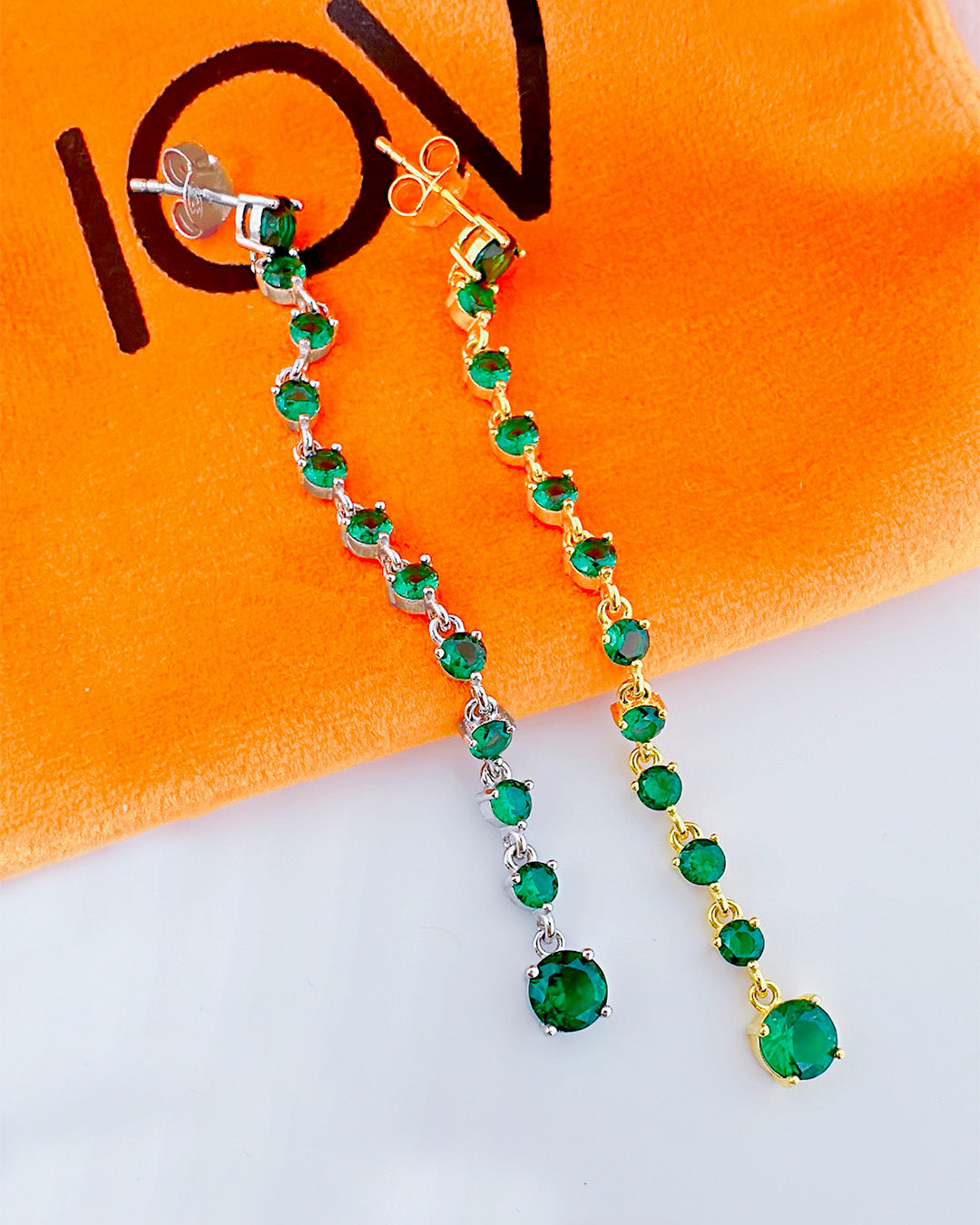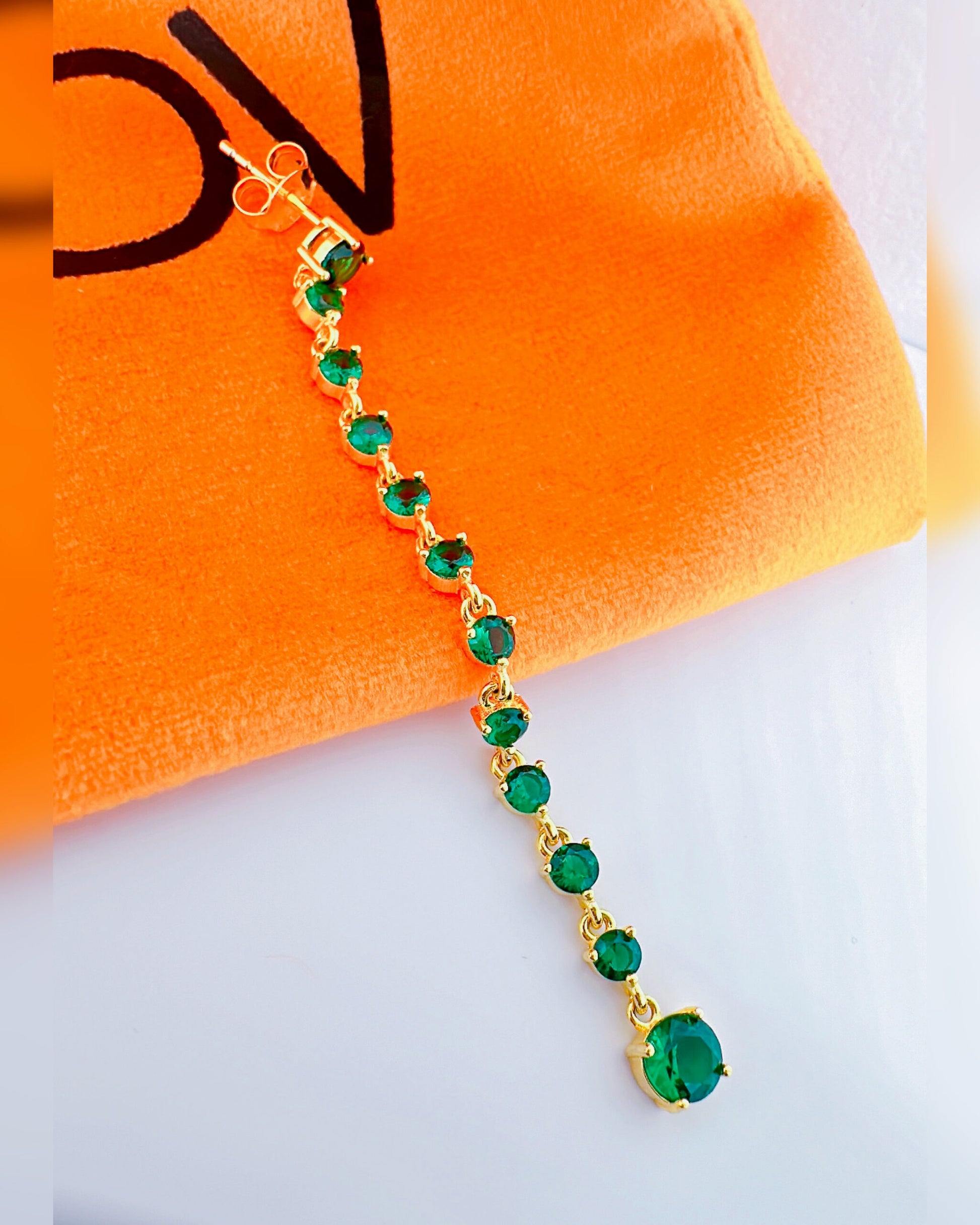 long line of emerald color round stones stud earring.