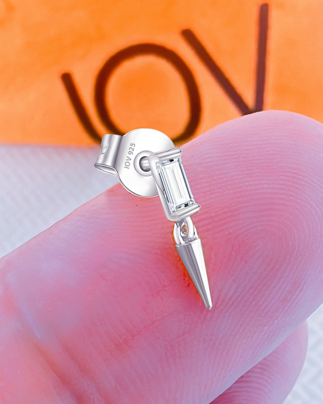 Baguette stud earring with dangling cone shape.