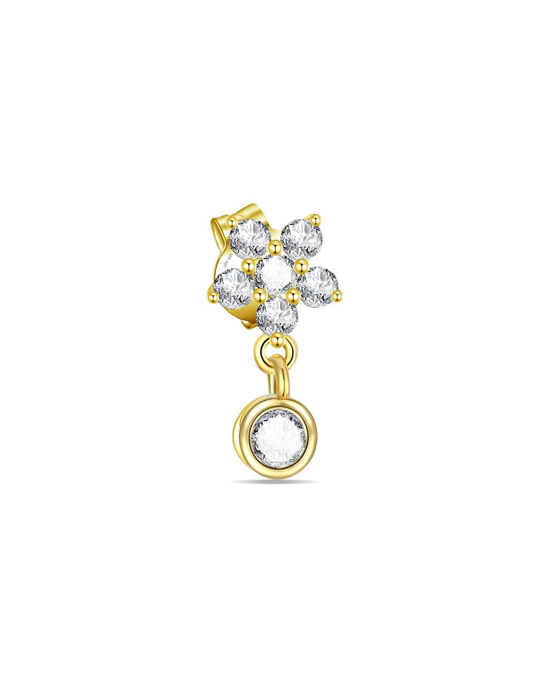 cluster of CZ stones in the shape of a flower with dangling stone in a bezel setting stud earring.