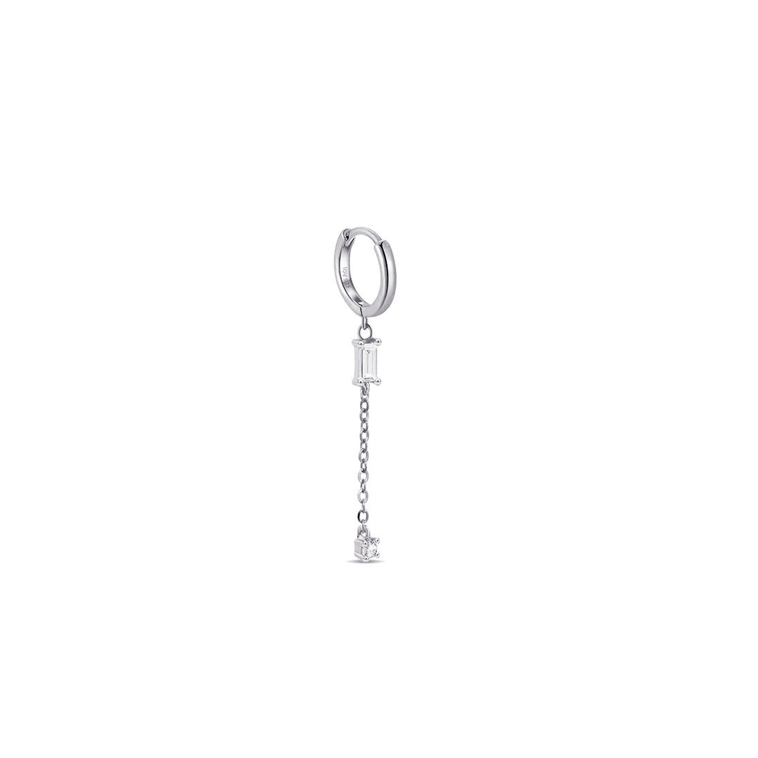 chain dangling hoop earring with baguette and round stones.