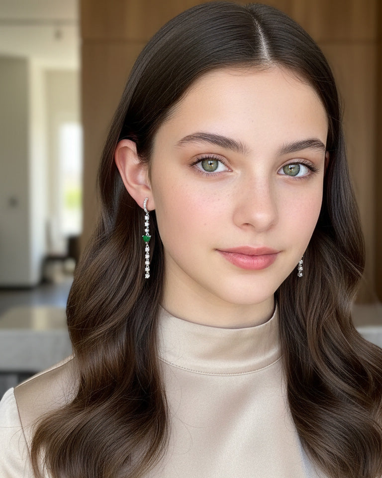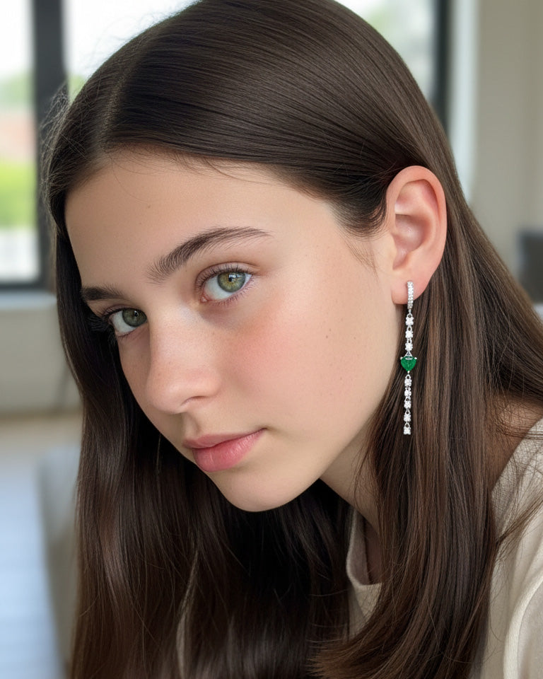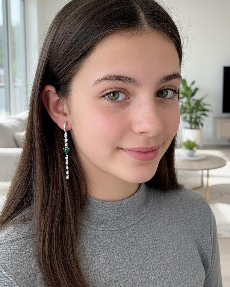 CZ huggie hoop with dangling line of CZ and emerald color heart shape.