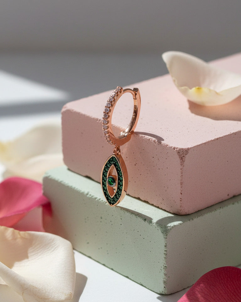 rosegold huggie hoop with dangling eye shape.